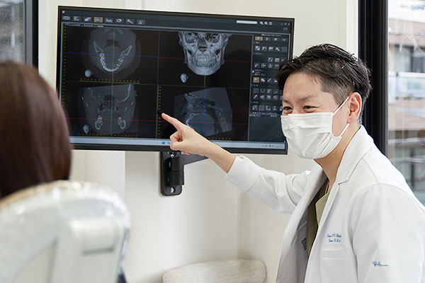 正確で安全な矯正治療を行うためには、精密な診断が不可欠です。当院では、歯科用CTとセファロ(頭部X線規格写真)を撮影し、歯並びだけでなく、あごの骨格的なバランスや歯根の状態まで詳細に分析します。これらの詳細なデータに基づき、経験豊富な矯正専門の歯科医師が、患者さんの将来的なかみ合わせ(咬合)まで考慮した、最善かつ無理のない治療計画を立案します。