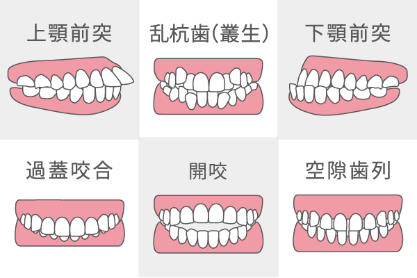 不正咬合とは、歯並びやかみ合わせが乱れている状態を指します。具体的には、出っ歯(上顎前突)や受け口(下顎前突)、デコボコ(叢生)、かみ合わせが深い(過蓋咬合)など様々なケースがあります。歯並びが乱れていると、見た目の問題だけではなく、歯ブラシが届きにくくなり、清掃状態が悪くなるため、むし歯や歯周病の原因となります。また、一部の歯に強い力がかかりすぎることで、歯の破折リスクが上がるなど、機能的にも様々な問題を引き起こします。